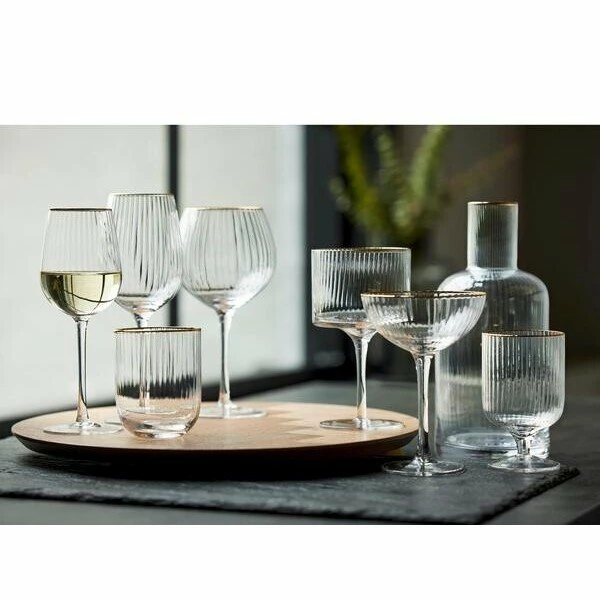 Mit dem Rotweinglas Palermo Gold von Lyngby servieren Sie Wein, geprĂ€gt von einem facettenreichen Spiel aus Farben und Licht. Die sanfte Formsprache und die geriffelte OberflĂ€che sorgen fĂŒr feinste Reflektionen, die dem Wein und Ihren GĂ€sten schmeicheln.
