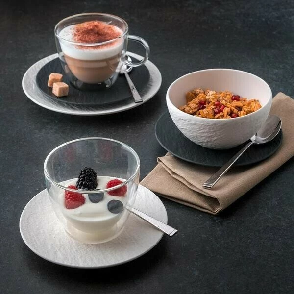 Das Geschirr aus durchgefĂ€rbtem Premium Porcelain wird von Hand bemalt und erhĂ€lt so den besonderen Look einer mattstrukturierten Schieferplatte. Als besonderen Kontrast zum Porzellan âMade in Germanyâ kamen doppelwandige Becher aus Glas hinzu, die sich dem Thema feiner Kaffee-Genuss widmen.