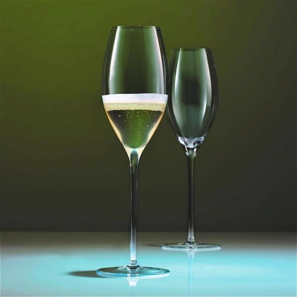 Prickelt garantiert: Dank Moussierpunkt steigt eine Perlenkette feiner BlĂ€schen vom Kelchboden auf. Mit diesen ChampagnerglĂ€sern von Zwiesel 1872 gelingt sowohl der Abend zu zweit als auch das Fest in gröĂerem Rahmen.